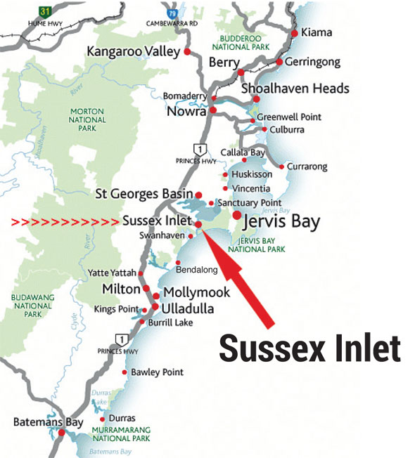 Situated on the coast, Sussex Inlet village is actually an island, which forms part of the Inlet to St Georges Basin from Wreck Bay in the Tasman Sea. The Island is connected by two bridges and there is only one road into the village which is a leisurely 15 minute drive from the Princes Highway. The road to Sussex Inlet is well signposted on the highway and is named the Sussex Inlet Road. Sussex Inlet District comprises the villages of Sussex Inlet, South Sussex, Berrara, Cudmirrah, Swanhaven and Badgee.
